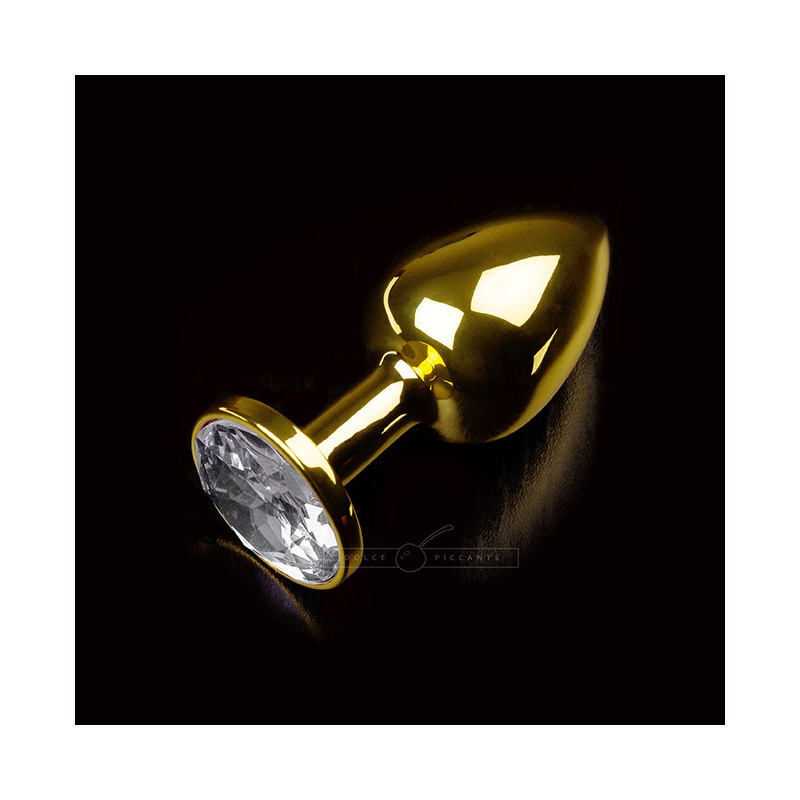 The Jewellery Gold Anal Plug White Crystal Small by Dolce Piccante is a premium butt plug that will add an instant touch of glamour to your anal play. The design has a completely smooth steel surface with a pointed tip to allow easy penetration. The gold plug also features an elegant rhinestone with a beautiful sparkle at the base. This small pleasure provider is the perfect choice for entry-level who want to spice up their intimate fun and explore anal play with a premium product. Made in Italy and crafted with great eye for detail, this trendy plug by Dolce Piccante will never go out of style.