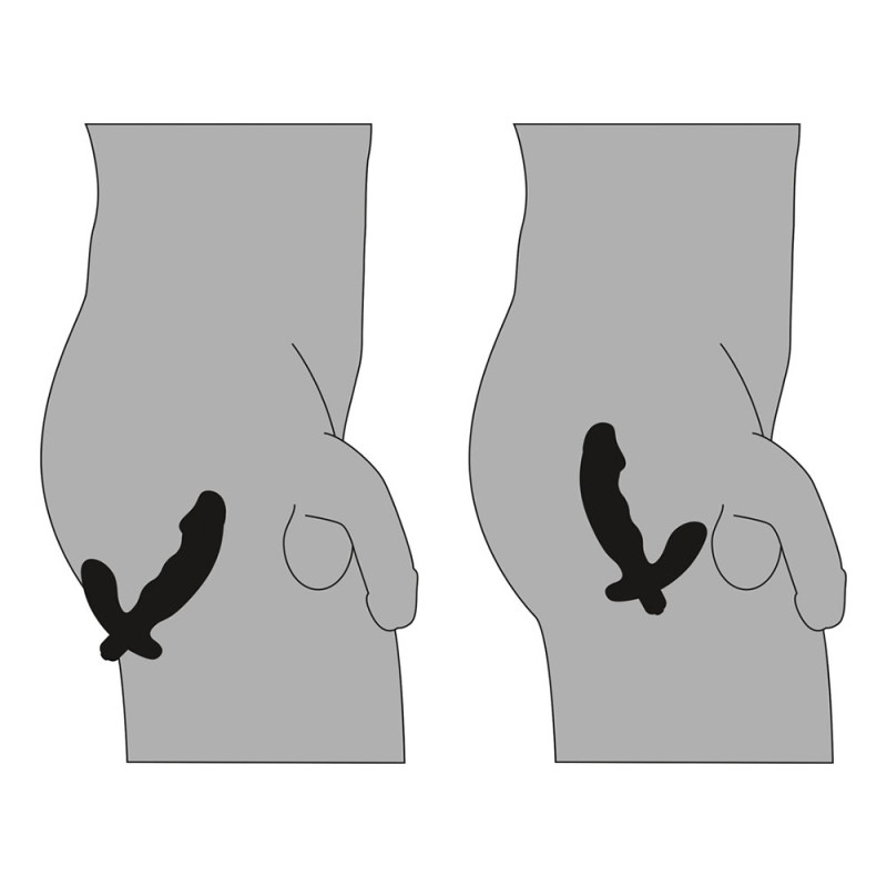 This black vibrator with a slightly wavy shaft and large glans at the tip has a cheeky extra: an additional perineum stimulator.